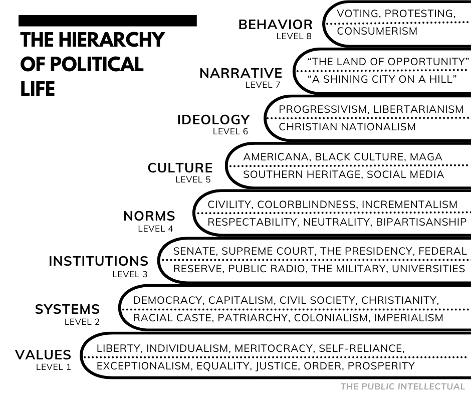 Understanding the hierarchy changes the way we interpret the moment. When something happens, it no longer just gets logged under “political dysfunction” or “societal collapse.” We can locate it within this structure. By being able to assign, label, and categorize, we’re better able to diagnose and develop targeted responses when we experience disease in our body politic.